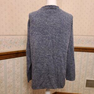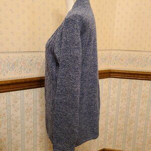 Pre-owned button-down front, long sleeve, 100% acrylic, machine wash cold, very warm and cozy in the color of heather periwinkle.