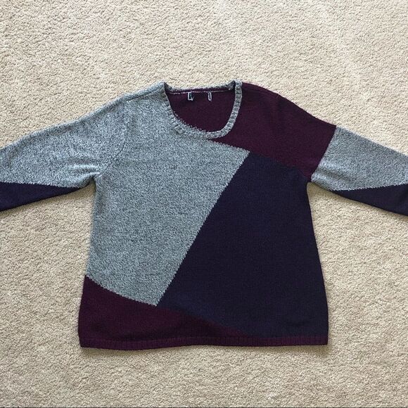 Vintage Karen Scott Women's Retro Oversize Sweater Geometric Block Print Colored Purple/ Maroon/ Grey. No size tag, but it looks to be a Medium, will update the measurements.