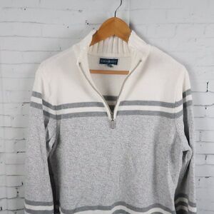 GREY STRIPE LONG SLEEVE 1/4 ZIP UP PULL OVER SWEATER SIZE MEDIUM BY KAREN SCOTT PRE OWNED LIKE NEW CONDITION