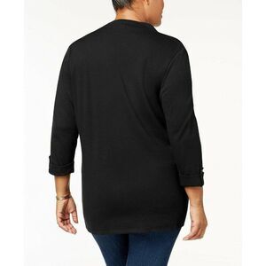 With a sleek open-front design, versatile roll-tab sleeves and useful zip pockets, Karen Scott's classic cardigan gets a sporty twist that's a perfect topper for your casual looks - Fits: True to size (is open and drapey) - X-Small = 0/2 - Approximate model measurements: height: 5'10"; bust: 35-1/2"; waist: 27"; hips: 35" - Loose fit; hits at hip - Due to generous sizing, we suggest sizing down for the perfect fit - Collarless; open front - Zip pockets at hips - 3/4-sleeves; roll-tab cuffs - Cotton/spandex - Machine washable - Imported