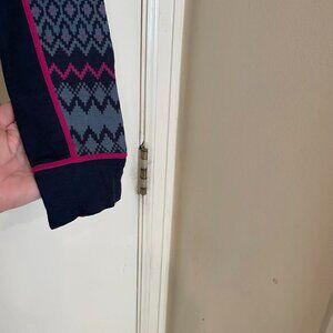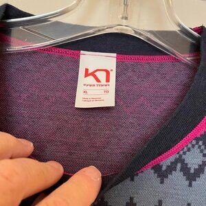 Pre-owned Kari Traa Agnes base layer in a Women's size XL in shades of navy blue, grey blue, and pink. The Kari Traa base layers run a size small, so this should fit someone who wears a size Large. Please see measurements below to make sure this will fit you. The top retails for $80.
