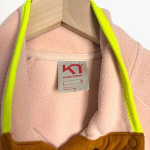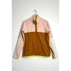- Keywords: fleece pullover, snap buttons, front pocket, retro style, light pink and brown with neon trim, hiking, skiing