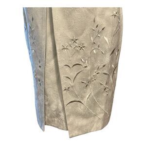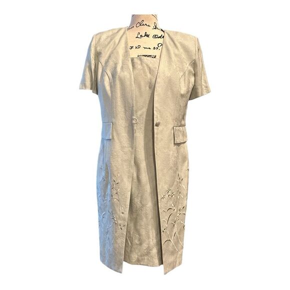 Beautiful muted pastel green floral pattern dress with embroidery by KARIN STEVENS, size 6p, front nonfunctional pockets, button loop from jacket closure, zipper back, shoulder pads, extra buttons attached, nwt, short sleeve on jacket, dress sleeveless, great for church, Easter 🐣, or any special day occasion, classy and elegant