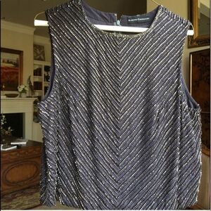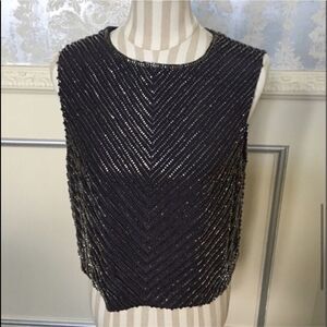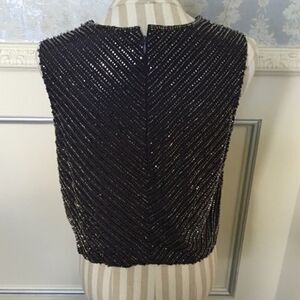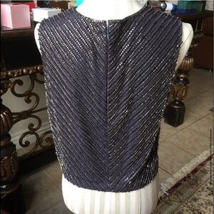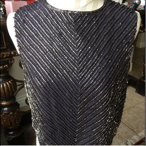 Be a stand out as the light catches and reflects on the bead detail. I purchased this from Saks as a size large that better fits a medium so I have listed this L as a M. The beads are heavy quality. Between the underarms this flares from 16-18” across. From the back collar to hem it’s approx 18.5”. The Shell is silk and the lining viscose.