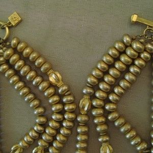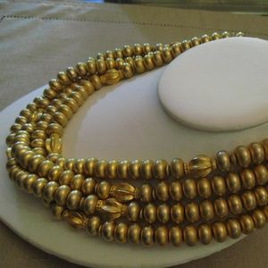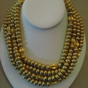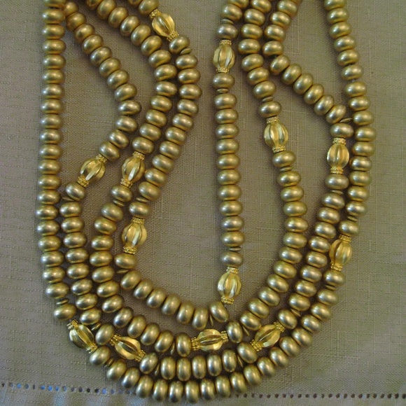 Never Worn vintage 1980's signed Karl Lagerfeld haute couture four strands matte finish gold-tone beaded necklace with a toggle clasp square tag signed KL. Any dark spots or areas are in the pictures only not on the necklace. Length: First strand 16 inches. Second strand 17 & 1/4 inches. Third strand 18 inches. Fourth stand 18 & 3/4 inches.