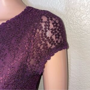 Purple lace blouse, short sleeve semi-sheer top, textured floral lace overlay, scoop neckline, elegant evening blouse, vintage-inspired lace shirt, women’s dressy top, plum purple semi-sheer blouse, classic fitted lace blouse.