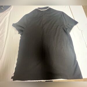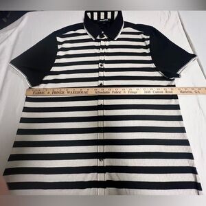 This Karl Lagerfeld shirt features a striking black and white striped pattern, perfect for a casual yet sophisticated look. This is a size large which seems to run small. Check dimensions in pictures. Button down front closure