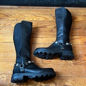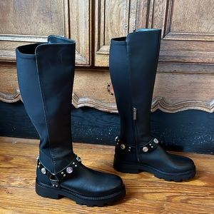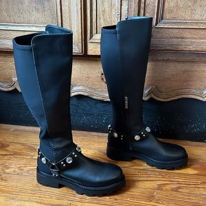 A rhinestone and stud embellished harness brings a moto-inspired edge to this boot secured with a soft stretch shaft for easy-on comfort.