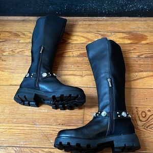 KARL LAGERFELD PARIS MILLA LEATHER RHINESTONE EMBELLISHED RIDING BOOTS