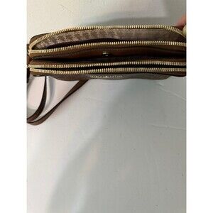 Hard to find Double zip top with middle snap slip pocket and outside slip pocket in preowned condition. It looks great but please note on one side the faux leather is coming apart from zipper and a very slight smudge on back. Slight wear here and there on edges. Hardly noticeable but please look at pics carefully. Adjustable shoulder strap. Great size for a small crossbody.