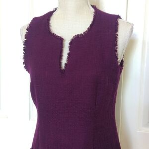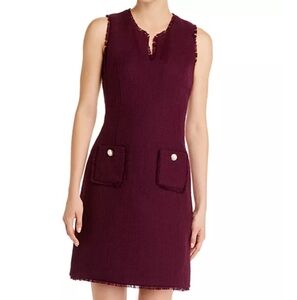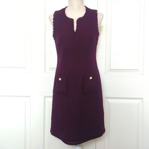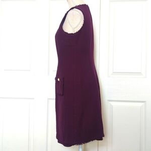 This elegant burgundy sleeveless dress is perfect for any occasion. Its rich color and classic design make it a versatile addition to your wardrobe. Split round neck. Sleeveless. Hip patch pockets with decorative buttons. Front and back princess seams. Concealed back zip with hook-and-eye closure. Allover tonal tweed, frayed trims. Lined. Cotton/polyester; lining: polyester
