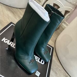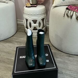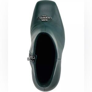 Signature details add fresh dimension to square toes and slender heels in the KARL LAGERFELD PARIS Vica booties.