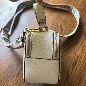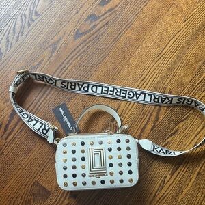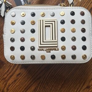 KARL LAGERFELD PARIS, the Simone Crossbody Bag. White w/ metallic buttons. NWT.