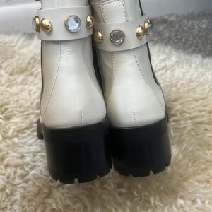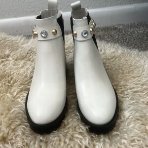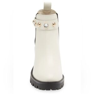 Polished studs and sparkling crystals refine the look of this sleek lug-sole bootie.