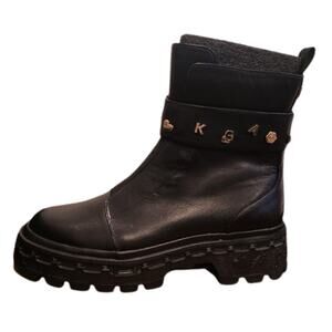 Step up your style with the KARL LAGERFELD Paris Latisha Booties, featuring a sleek black leather design accented by the brand’s signature metallic hardware. These fashion-forward lug-sole boots combine edge and comfort with a 2” heel and sturdy EVA platform. Finished with a functional front zipper and almond toe, they’re perfect for everyday wear or elevating a night-out look. Brand new and never worn.