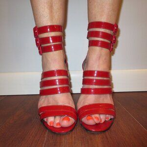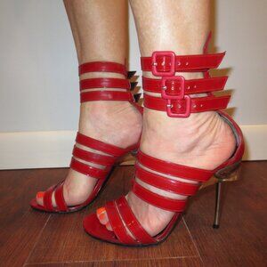 Worn once, KARL LAGERFELD made in Italy red all leather triple ankle strap high heel sandals, size 6.5. I believe these are vintage and appear to be worn once. very sexy strap pattern on the foot, triple buckled ankle straps, 4 inch stiletto heels. No box or bag