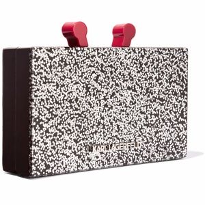 Net-A-Porter description: Karl Lagerfeld's futuristic box clutch is crafted from glittered acrylic and playfully finished with a robot caricature of the designer. This compact style opens to a soft satin interior that fits essentials like your cell phone, cash and keys. Carry it in hand or attach the chain shoulder strap. Removable shoulder strap,