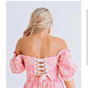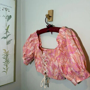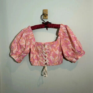 KARLIE Floral Poplin Puff Sleeve Top Corset Blouse Pink Floral size Small