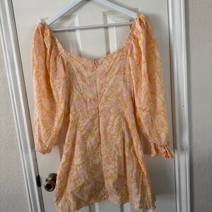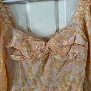 Peach & yellow floral pattern,Sweetheart neckline, front tie Puff sleeves with ruffle cuffs Ruffle hem, mini lengthFeminine & lightweight design