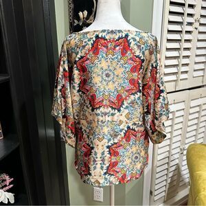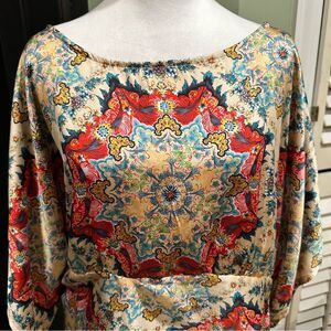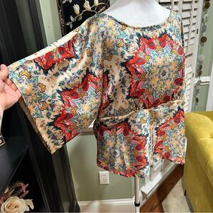 Make a bold statement with this eye-catching boho blouse by KAS New York, designed exclusively for Anthropologie. Features a silky feel, wide boat neckline, dramatic batwing sleeves, and a striking kaleidoscope-inspired floral print in rich red, teal, yellow, and navy tones.