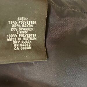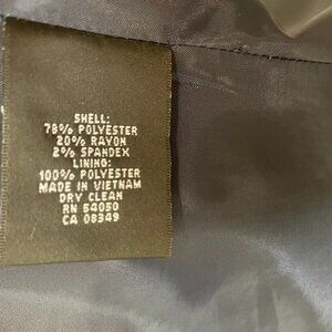 Kasper Suit with fully lined sheath dress and jacket in navy. First picture shows actual color. Dress and jacket are polyester blend of 78% polyester, 20% rayon, and 2% spandex which gives a cotton soft feel. Dress is sleeveless with scoop neck, has long back zipper for ease in wearing, and a back kick vent. Jacket has two button front closure with front side slit pockets that have never been opened. Beautiful suit in new condition. Great for court, office.