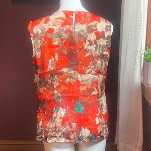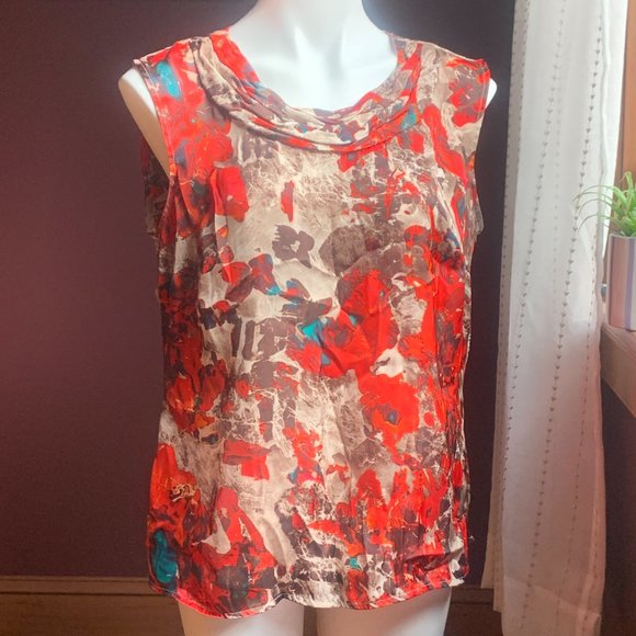 KASPER Red Taupe Blue Abstract Floral Sleeveless Ruched Neckline Blouse L. Excellent Used Condition.