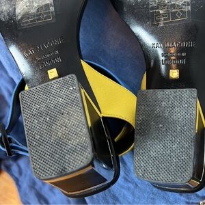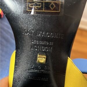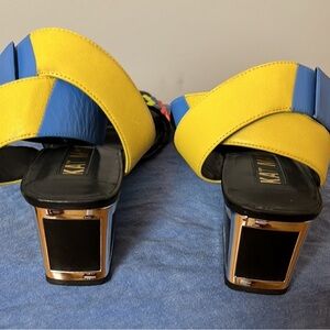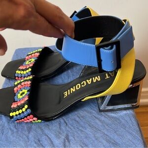 Step into color with these stunning Kat Maconie high-heeled sandals, crafted for the confident trendsetter. Featuring a black base and intricate beadwork in vibrant red, yellow, blue, and pink, these heels are wearable art. The ankle strap pops in blue with black and yellow accents, secured by a sleek buckle for added flair and stability.