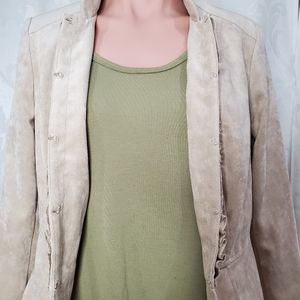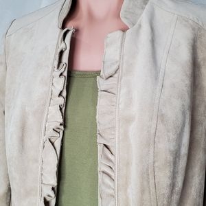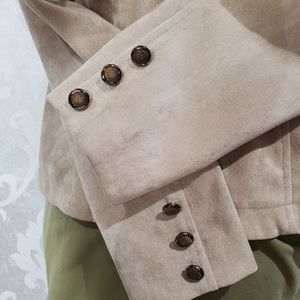 Long sleeve blazer jacket. Faux suede soft like feel. Lightweight. Unlined. Ruffle detailing. Silver and gold button details on sleeves. Hook and eye closure. Peplum back. Popped collar. Stretch. Shoulder pads.