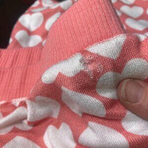 Pre-owned. There is some pilling on the pink ribbed areas along neckline, waistband, and cuffs. A small hole on front left pocket (see pictures)