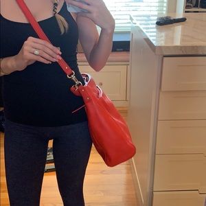 Can be worn using the hand strap or the cross body strap. This bag is in amazing amazing condition and is the perfect size. SO cute.