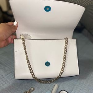 It had a slip in pocket in the interior and two handbag straps , a gold one that attached inside the bag and another strap that is removable as shown in the pictures.
