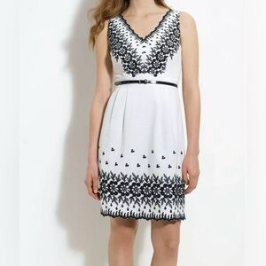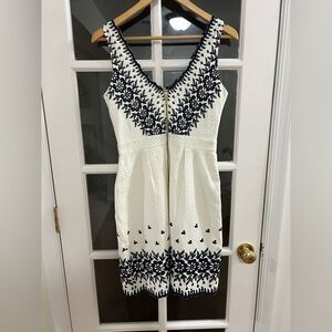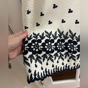 White and navy Kate Spade Amy dress with floral embroidery throughout, V-neck, belt at waist, scalloped hem and exposed gold-tone zip closure at back.