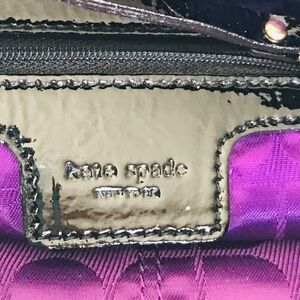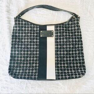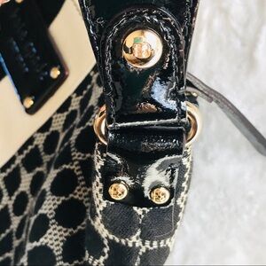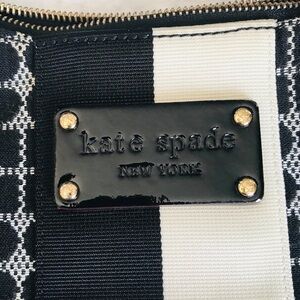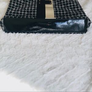 kate spade 15” wide by 12” tall with a 6” strap hang. Black and white patterned fabric with top zip closure. Patent leather 1 zipper pocket and 2 slot pockets.