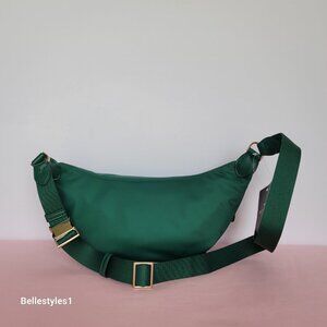 BRAND NEW WITH TAGS. Deep Jade color. A Belt bag with a sleek streamlined silhouette designed for hands-free wear with enough room for your small essentials to go with you anywhere or while traveling. Crafted of 100% recycled nylon with smooth PVC trim. Features a front zip pocket for additional storage and easy access. Adjustable strap to wear around the waist or across the chest with fabric zipper-pull.