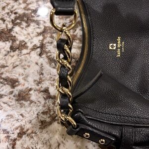 Black with gold hardware bag has 9” drop handle with chain detail. Measures approximately 10” x 13”. Bottom measures 5” x 10”. Very soft textured leather. Interior is black satin lined with two slip pockets and one zippered pocket. Never used and in excellent condition.
