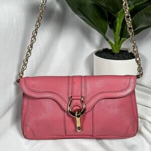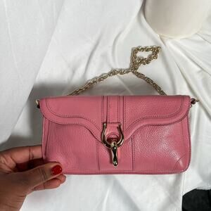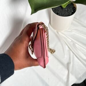 Chic and timeless, this Kate Spade pink leather pochette is the perfect pop of color for your wardrobe. Crafted from smooth pebbled leather with gold-tone hardware, it features a chain shoulder strap, an elegant clasp lock closure, and a built-in mirror inside the flap — ideal for touch-ups on the go. Compact yet structured, it fits small essentials like your phone, keys, and lipstick while keeping a polished silhouette.