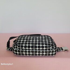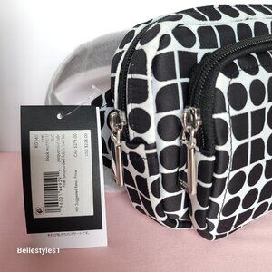 BRAND NEW WITH TAGS. Black Multi color. (Black/White) A sporty belt bag with double zip-around closure for your small essentials. Designed for hands-free wear around the waist or across the chest to go anywhere or while traveling. Crafted of 100% recycled polyester Jacquard with smooth leather trim. Features a front zip-around pocket with 2 credit card slots for additional storage and easy access.