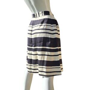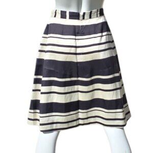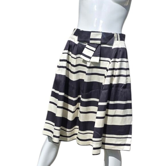 Gorgeous silk skirt by KATE SPADE. Black and cream stripes with a flat bow at the front waist band, 2 hidden front pockets, back zip closure. Hits just above the knee. Fully lined. Very good pre-owned condition.