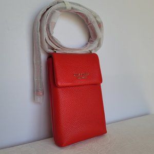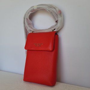 BRAND NEW WITH TAGS. Heirloom Tomato color. A phone crossbody with flap-over magnetic-snap closure for easy access to the cell phone. Crafted of rich pebbled leather with a chain and leather strap for shoulder or crossbody wear. Features 3 interior credit card slots for added storage.