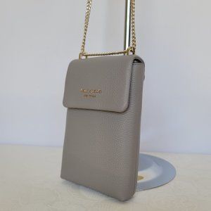 BRAND NEW WITH TAGS. True Taupe color. A phone crossbody with Flap-over magnetic-snap closure for easy access to the cell phone. Crafted of rich Pebbled leather with a chain and leather strap for shoulder or crossbody wear. Features 3 interior credit card slots for added storage.