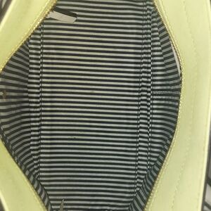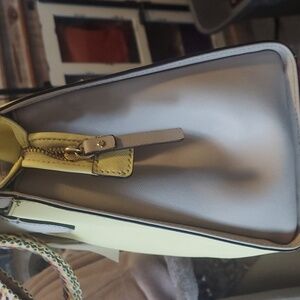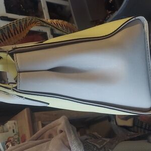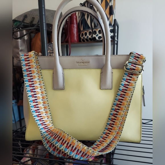 Vibrant yellow body with elegant tan/beige accents on the top trim and handles.