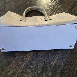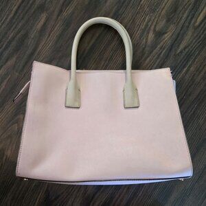 Beautiful pastel pink and taupe trimmed structured tote bag from KATE SPADE. Very, very gently loved (barely!) and in excellent quality and condition. Double handles. Zipper top. Spacious interior with black and white fabric lining. One zipper side pocket and two open pockets. KATE SPADE authentic label and logo on interior and exterior. Exterior has one lengthwise snap pocket. Gold feet. Missing crossbody strap. DIMENSIONS: 13" wide x 10" tall x 5" width x 6" double handle drop x 8" x 13" depth. Gorgeous bag! Polyurethane/faux leather exterior and polyester fabric interior lining.