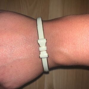 Kate Spade Mini Bow Bangle. The color is a cream color with gold base and gold inside. The inside of the bracelet reads “Kate Spade New York”. It is a bangle so there is no opening or close the bracelet, it slips on over your hand. This does mean once it’s on there is some space between your wrist and the bracelet, it’s a loose fit.