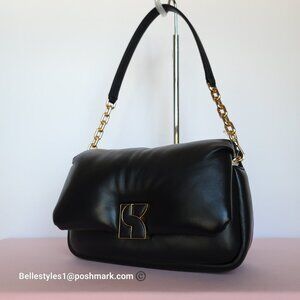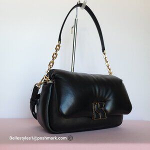 BRAND NEW WITH TAGS. Black color. A distinctively luxe convertible bag with enough room for your small essentials with magnetic snap-flap closure. Comes with a detachable chain and leather top handle and an optional long strap for shoulder or crossbody wear. Crafted of soft smooth puffy leather and a large Signature K logo at front for a modern sophisticated look.