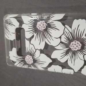 KATE SPADE Flexible Hardshell Case Tropical Floral Design Clear with white floral patttern and silver glitter details Designed for Samsung Galaxy Note8 New in original box Cell phone protective case Decorative cell phone holder Phone case Playful & Strong Drop-Tested 6 feet