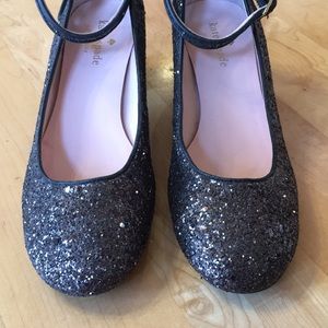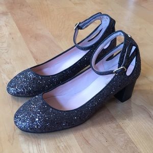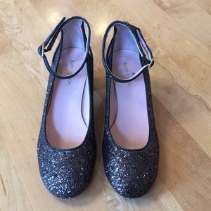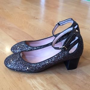 Kate Spade Glitter Block Heels. Closed Rounded Toe. Adjustable Ankle Strap. Very good pre-owned condition with light/normal signs of wear. US Size 7 M. Approximate heel height 1 3/4".