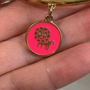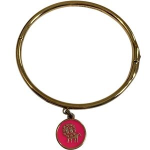 Adorable Kate Spade New York gold-tone bangle bracelet featuring a signature pink enamel medallion charm with an embossed gold lion design. The back of the charm is engraved with the empowering phrase “SHE LEADS THE WAY” - perfect Kate Spade whimsy and inspiration! 006