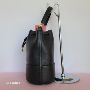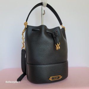 BRAND NEW WITH TAGS. Black color. A chic sophisticated bucket style bag with drawstring closure for easy, everyday organization to carry your essentials. It comes with a top handle and a chain & leather strap for shoulder or crossbody wear. Crafted from pebbled leather with smooth leather trim, decorated with a Spade-link accents and a front plaque logo for added detail.
