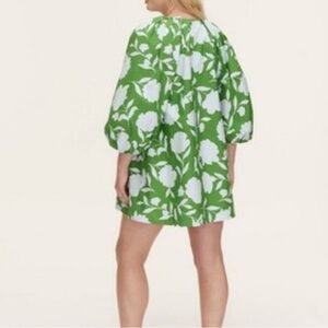 Floral print, Long bell sleeves with elastic cuffs, heart shaped neckline with pleating, fully lined (except in sleeves), pockets.