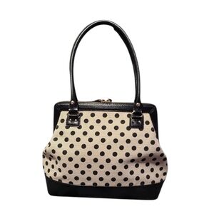 Canvas shoulder bag with leather accents and a red interior. Just beautiful in great used condition.